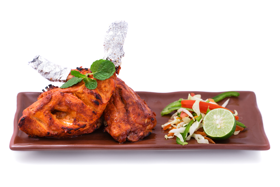 Tandoori chicken is a dish originating in the Indian subcontinent. It consists of roasted chicken prepared with yogurt and spices. The name comes from the type of cylindrical clay oven, a tandoor, in which the dish is traditionally prepared.